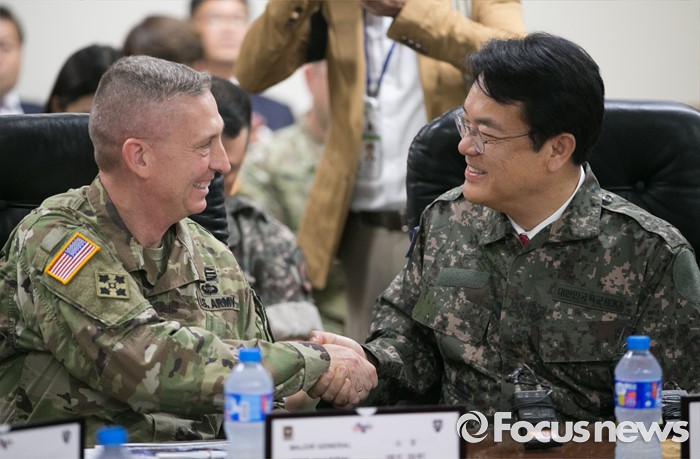 (의정부=포커스뉴스) 정진석(오른쪽) 새누리당 원내대표가 24일 오전 경기도 의정부 미2사단 한미연합사단을 방문해 부대 현황보고에 앞서 인사말을 마친 뒤 테드 마틴 미2사단장과 악수하고 있다.