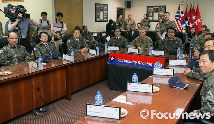(의정부=포커스뉴스) 정진석 새누리당 원내대표와 김영우 국방위원장 등 의원들이 24일 오전 경기도 의정부 미2사단 한미연합사단을 방문해 부대 현황보고를 받고 있다.