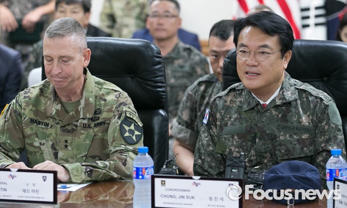 (의정부=포커스뉴스) 정진석 새누리당 원내대표가 24일 오전 경기도 의정부 미2사단 한미연합사단을 방문해 부대 현황보고에 앞서 인사말을 하고 있다. 왼쪽은 테드 마틴 미2사단장.