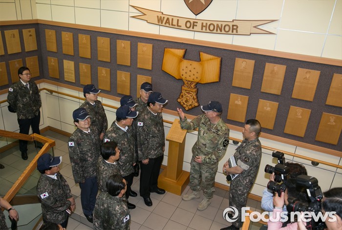(의정부=포커스뉴스) 정진석 새누리당 원내대표와 김영우 국방위원장 등 의원들이 24일 오전 경기도 의정부 미2사단 한미연합사단을 방문해 테드 마틴 미2사단장으로부터 명예훈장 수여자 패널에 대한 설명을 듣고 있다.
