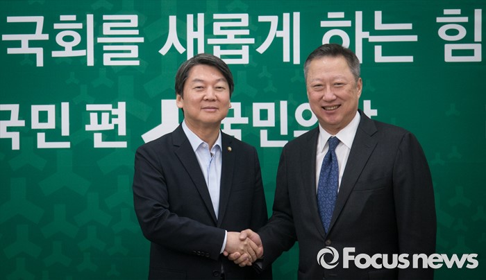(서울=포커스뉴스) 안철수 국민의당 상임공동대표와 박용만 대한상공회의소 회장이 24일 오전 서울 여의도 국회에서 만나 인사하고 있다.