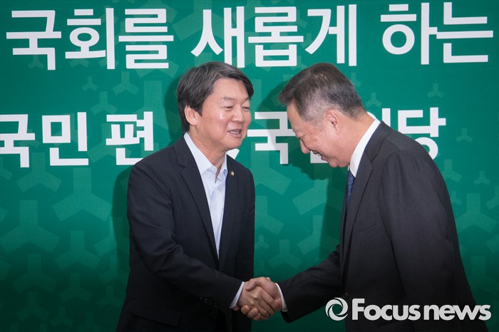 (서울=포커스뉴스) 안철수 국민의당 상임공동대표와 박용만 대한상공회의소 회장이 24일 오전 서울 여의도 국회에서 만나 인사하고 있다.