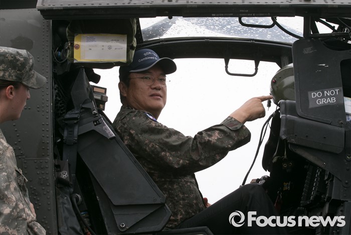 (의정부=포커스뉴스) 정진석 새누리당 원내대표가 24일 오전 경기도 의정부 미2사단 한미연합사단을 방문해 부대현황 보고를 받은 뒤 아파치 헬기 탑승체험을 하고 있다.