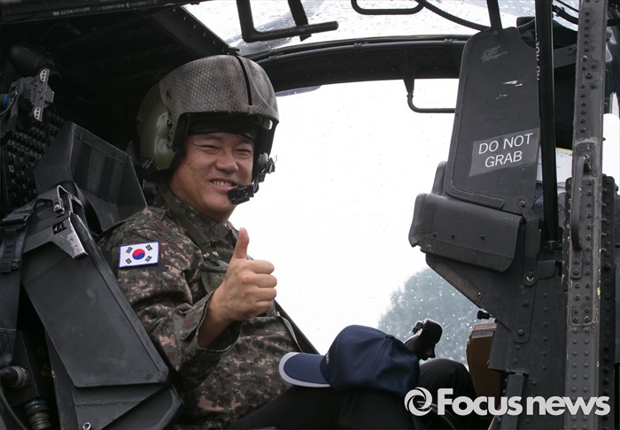 (의정부=포커스뉴스) 정진석 새누리당 원내대표가 24일 오전 경기도 의정부 미2사단 한미연합사단을 방문해 부대현황 보고를 받은 뒤 아파치 헬기에 올라 포즈를 취하고 있다.