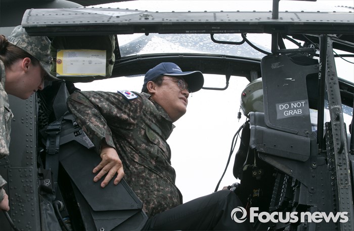 (의정부=포커스뉴스) 정진석 새누리당 원내대표가 24일 오전 경기도 의정부 미2사단 한미연합사단을 방문해 부대현황 보고를 받은 뒤 아파치 헬기 탑승체험을 하고 있다.