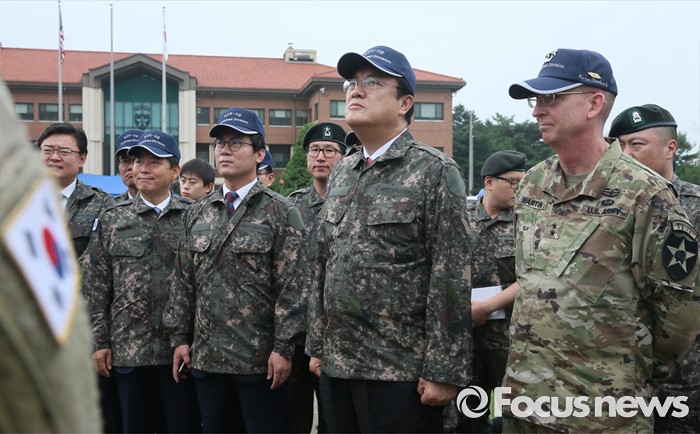 (의정부=포커스뉴스) 정진석 새누리당 원내대표, 김영우 국방위원장 등 의원들이 24일 오전 경기도 의정부 미2사단 한미연합사단을 방문해 부대현황 보고를 받은 뒤 아파치 헬기를 살펴보고 있다.