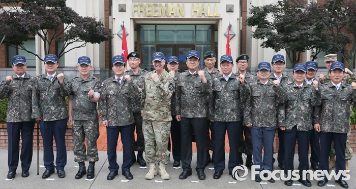 (의정부=포커스뉴스) 정진석 새누리당 원내대표, 김영우 국방위원장 등 의원들이 24일 오전 경기도 의정부 미2사단 한미연합사단을 방문해 테드 마틴 미2사단장 등 군 관계자들과 기념촬영을 하고 있다.
