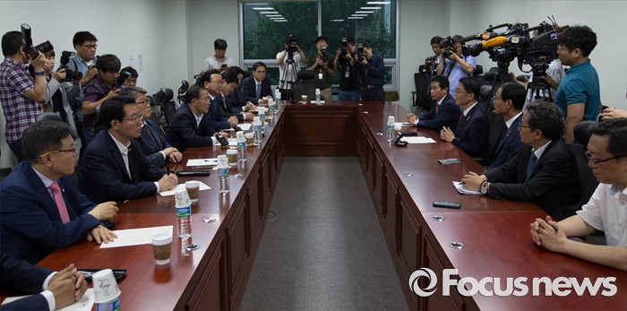 (서울=포커스뉴스) 24일 오후 서울 여의도 국회 의원회관에서 윤재옥 새누리당 대구시당 위원장, 김부겸 더불어민주당 의원, 홍의락 무소속 의원 등 여야 대구지역 의원들과 강호인 국토교통부 장관이 영남권 신공항 백지화 관련 면담을 하고 있다.