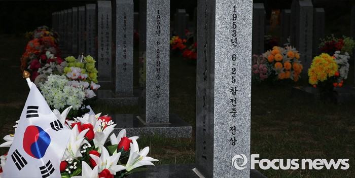 (대전=포커스뉴스) 6·25전쟁 66주년을 하루 앞둔 24일 오후 대전 유성구 국립대전현충원 6.25 전쟁 참전 용사의 묘비 앞에 태극기가 바람에 휘날리고 있다.