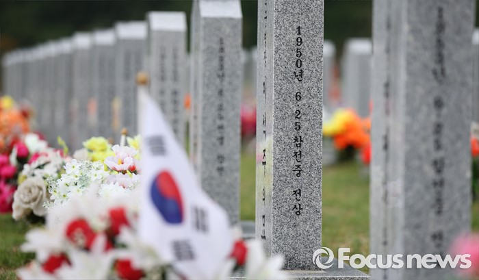 (대전=포커스뉴스) 6·25전쟁 66주년을 하루 앞둔 24일 오후 대전 유성구 국립대전현충원 6.25 전쟁 참전 용사의 묘비 앞에 태극기가 바람에 휘날리고 있다.