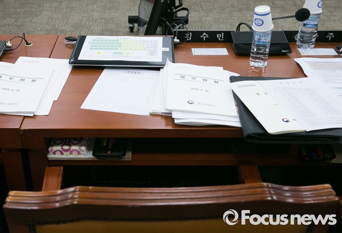 (서울=포커스뉴스) 24일 오후 서울 여의도 국회에서 열린 산업통상자원위원회 전체회의에 불참한 김수민 국민의당 의원의 빈 자리가 보이고 있다. 리베이트 수수 의혹을 받고 있는 김 의원은 전날 검찰에 출석해 조사를 받았다.