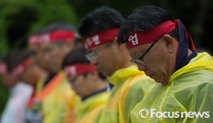 (서울=포커스뉴스) 24일 오후 서울 영등포구 산업은행 앞에서 열린 '성과급제 폐지와 노동기본권 쟁취를 위한 공무원·교사 결의대회'에 참가한 최종진(오른쪽) 전국민주노동조합총연맹 수석부위원장과 전교조, 전공조 조합원들이 민중의례 하고 있다.