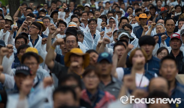 (서울=포커스뉴스) 24일 오후 서울 영등포구 산업은행 앞에서 열린 '성과급제 폐지와 노동기본권 쟁취를 위한 공무원·교사 결의대회'에 참가한 전국교직원노동조합과 전국공무원노동조합 조합원들이 구호를 외치고 있다.