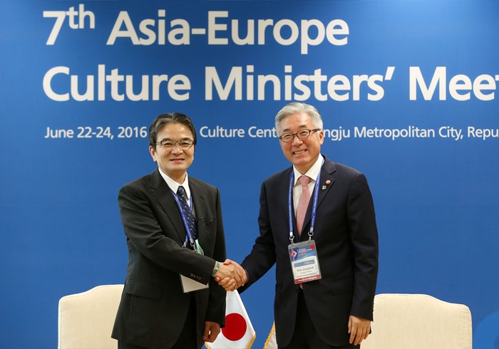 (광주=포커스뉴스) 김종덕(오른쪽) 문화체육관광부 장관이 23일 제7차 ASEM 문화장관회의가 열리고 있는 광주시 동구 국립아시아문화전당에서 미야타 료헤이(Ryohei Miyata, 宮田 亮平) 일본 문화청장과 접견을 하고 있다. <사진제공=문화체육관광부>