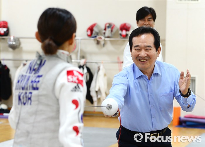 (서울=포커스뉴스) 정세균 국회의장이 24일 오후 서울 노원구 태릉선수촌을 방문해 브라질 리우 올림픽을 앞두고 훈련 중인 남현희 선수와 펜싱 대결을 하고 있다.