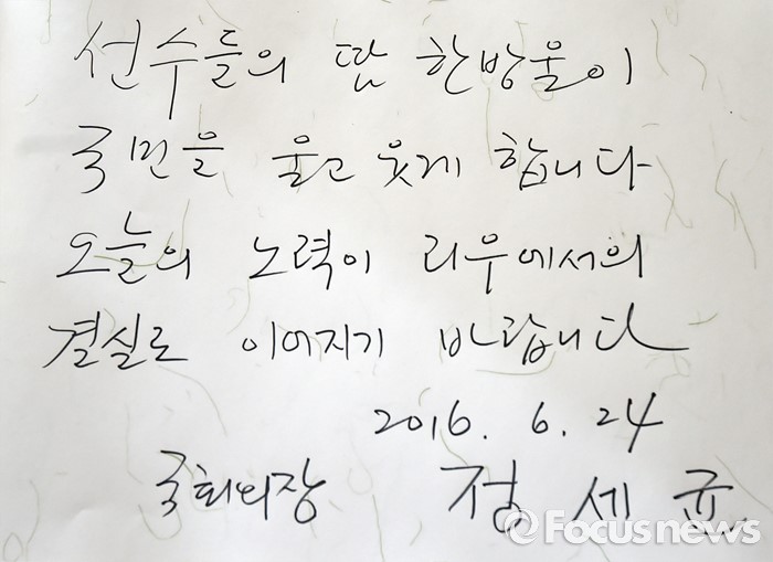 (서울=포커스뉴스) 정세균 국회의장이 24일 오후 서울 노원구 태릉선수촌을 방문해 브라질 리우 올림픽 성공을 기원하며 방명록을 작성했다. 사진은 정 의장이 남긴 글귀.