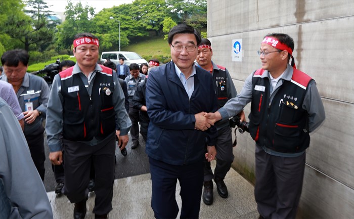 (거제=포커스뉴스) 이기권 고용노동부 장관이 24일 경남 거제 대우조선해양 노사와 간담회를 갖고 업황 부진으로 어려움을 겪는 조선업 종사자 의견을 청취했다. 간담회에 앞서 직원과 악수를 하고 있다. <사진제공=고용노동부>