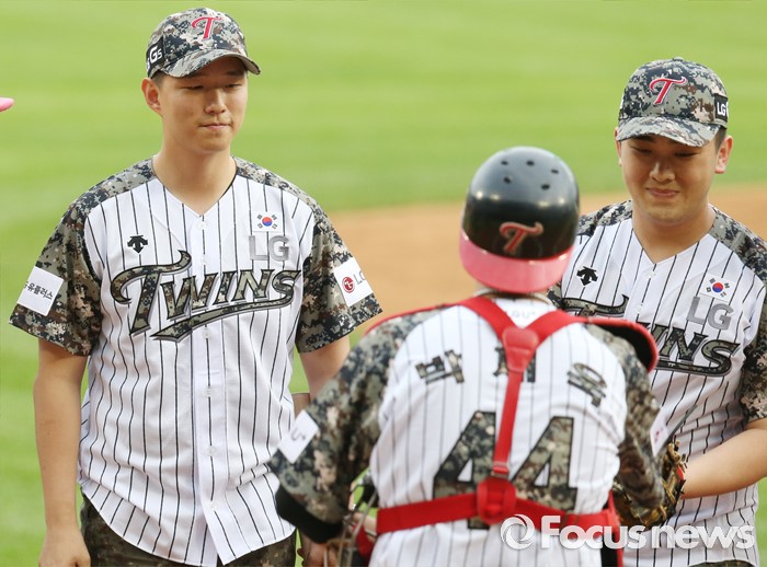 (서울=포커스뉴스) 24일 서울 잠실구장에서 열린 2016 프로야구 넥센-LG 경기에 앞서 6.25전쟁 발발 66주년을 맞아 '땡큐 솔저스' 행사를 갖고 북한의 지뢰 도발로 부상당한 하재헌 하사(오른쪽)와 김정원 하사가 시구,시타를 마치고 LG 포수 박재욱과 악수하고 있다.