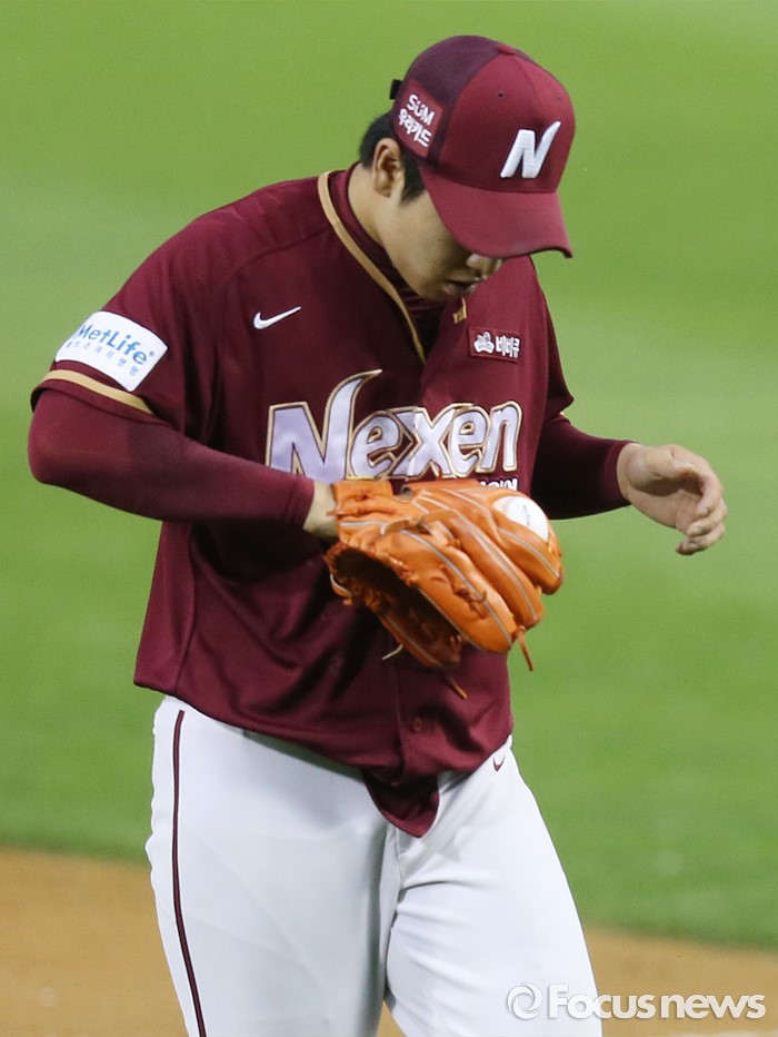 (서울=포커스뉴스) 24일 서울 잠실구장에서 열린 2016 프로야구 넥센-LG 경기 4회말 2사 2,3루에서 넥센 투수 김택형이 글러브에 낀 LG 정성훈의 강습타구를 보고 있다.