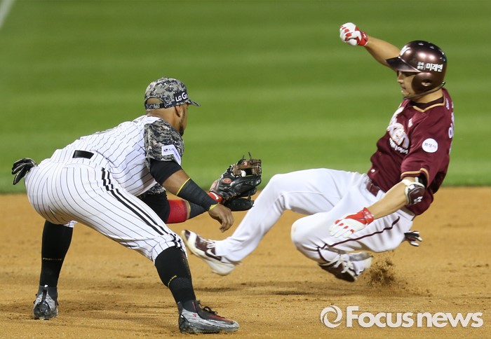 (서울=포커스뉴스) 24일 서울 잠실구장에서 열린 2016 프로야구 넥센-LG 경기 5회초 2사 3루에서 넥센 이택근이 우중간 펜스 앞에 떨어지는 안타를 치고 3루까지 달리다 LG 히메네스에게 태그아웃되고 있다.