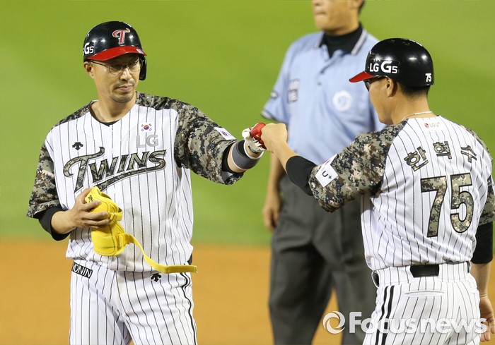 (서울=포커스뉴스) 24일 서울 잠실구장에서 열린 2016 프로야구 넥센-LG 경기 6회말 1사 3루에서 LG 정성훈이 중전 적시타로 3루주자를 불러들이고 1루에서 한혁수 코치와 주먹을 마주치고 있다.