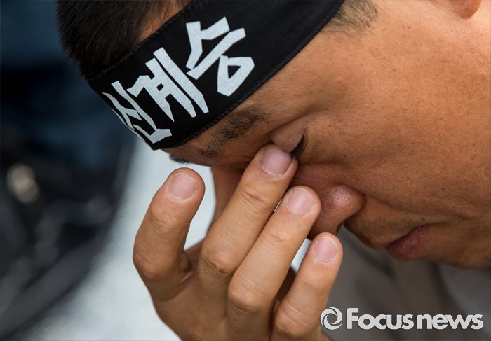 (서울=포커스뉴스) 24일 오후 서울 서초구 현대자동차 본사 앞에서 열린 '유성기업 故 한광호씨 100일ㆍ현대차 진격의 날' 집회에 참석한 한 노동자가 생각에 잠겨 있다.