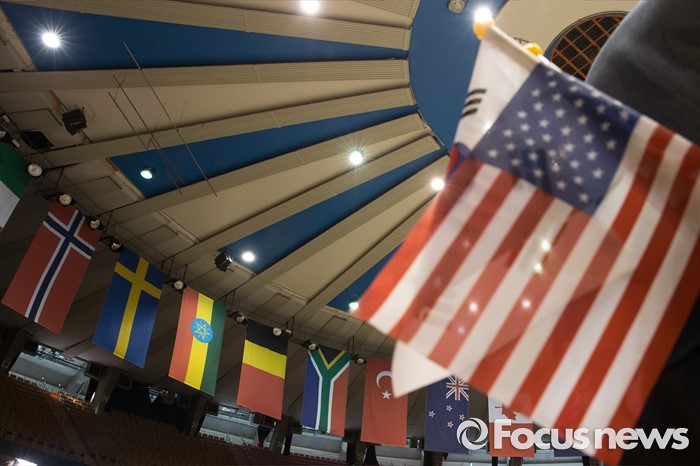 (서울=포커스뉴스) 25일 오전 서울 송파구 잠실실내체육관에서 열린 '6.25전쟁 66주년 기념식'에 참전국들의 국기가 걸려있다.