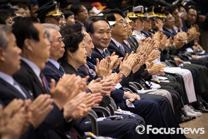 (서울=포커스뉴스) 25일 오전 서울 송파구 잠실실내체육관에서 열린 '6.25전쟁 66주년 기념식'에 참석한 박승춘(가운데) 국가보훈처장이 박수치고 있다.