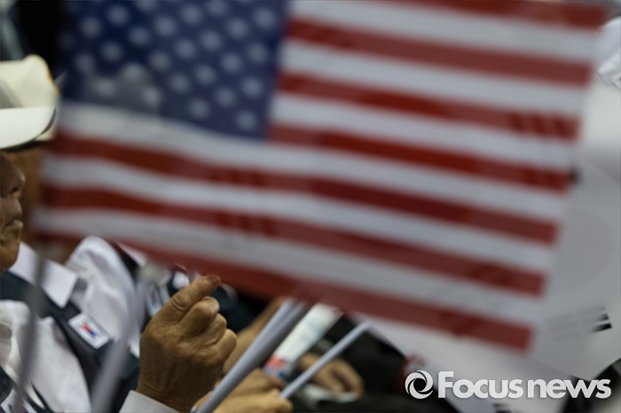 (서울=포커스뉴스) 25일 오전 서울 송파구 잠실실내체육관에서 열린 '6.25전쟁 66주년 기념식'에 참석한 참전용사 및 시민들이 성조기와 태극기를 흔들고 있다.