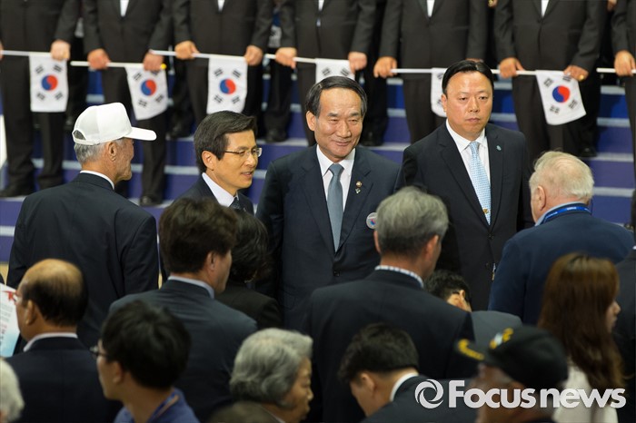 (서울=포커스뉴스) 25일 오전 서울 송파구 잠실실내체육관에서 열린 '6.25전쟁 66주년 기념식'에 참석한 황교안(왼쪽 두 번째) 국무총리와 박승춘(오른쪽 두 번째)가 식이 끝나고 퇴장하고 있다.
