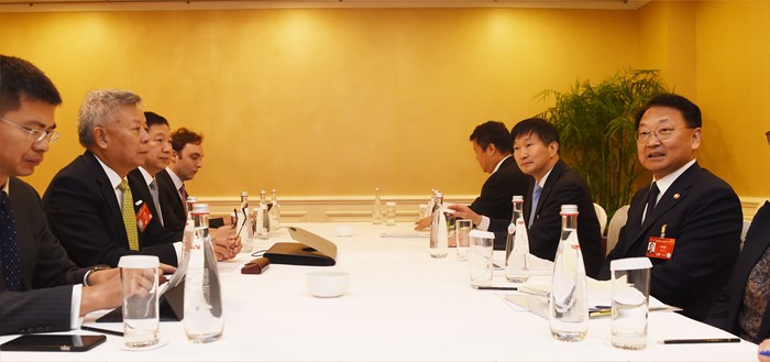 (서울=포커스뉴스) 제1차 아시아인프라개발은행(AIIB) 연차총회 참석차 중국 북경을 방문중인 유일호 부총리 겸 기획재정부 장관이 25일 월드호텔에서 진리 췬 AIIB 총재와 면담을 하고 있다. <사진제공=기획재정부>