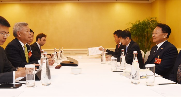 (서울=포커스뉴스) 제1차 아시아인프라개발은행(AIIB) 연차총회 참석차 중국 북경을 방문중인 유일호 부총리 겸 기획재정부 장관이 25일 월드호텔에서 진리 췬 AIIB 총재와 면담을 하고 있다. <사진제공=기획재정부>