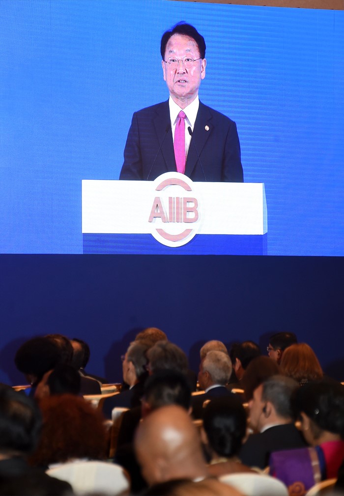 (서울=포커스뉴스) 유일호 부총리 겸 기획재정부 장관이 25일 중국 북경 월드호텔에서 열린 '제1차 아시아인프라개발은행(AIIB) 연차총회' 참석해 기조연설을 하고 있다. <사진제공=기획재정부>