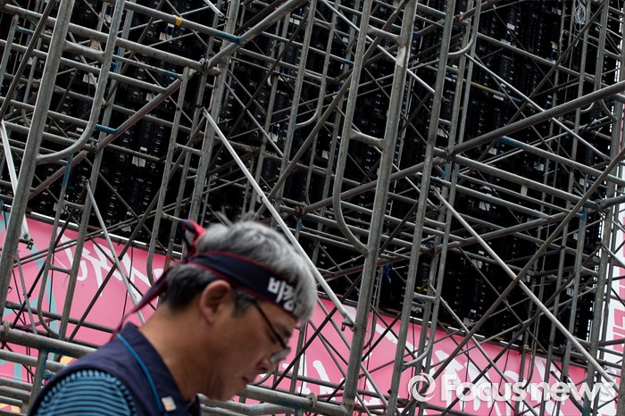 (서울=포커스뉴스) 25일 오후 서울 중구 시청광장에서 열린 '민주노총 전국노동자대회' 참석자들이 최저임금 1만원, 비정규직 철폐를 촉구하고 있다.