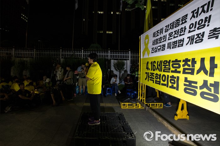 (서울=포커스뉴스) 25일 오후 서울 종로구 서울정부청사 앞에서 세월호 가족협의회 및 시민들이 세월호 특별법 개정과 온전한 인양을 촉구하며 농성을 벌이고 있다.