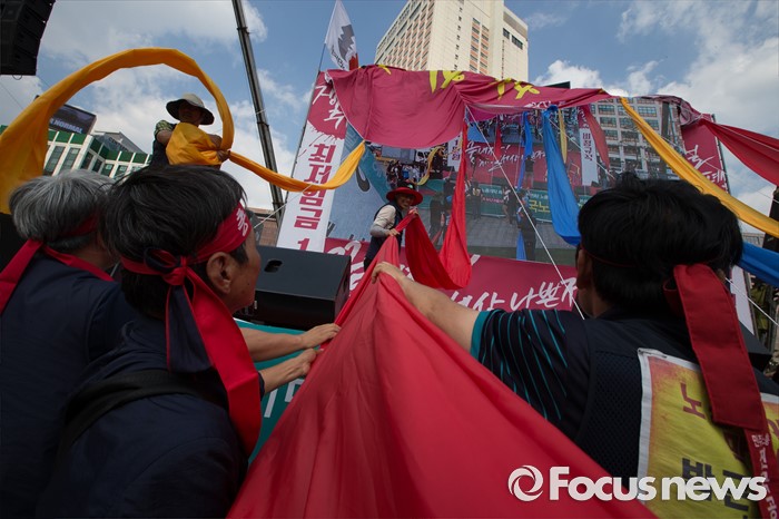 (서울=포커스뉴스) 25일 오후 서울 중구 시청광장에서 열린 '민주노총 전국노동자대회' 참석자들이 최저임금 1만원, 비정규직 철폐를 촉구하며 퍼포먼스를 하고 있다.