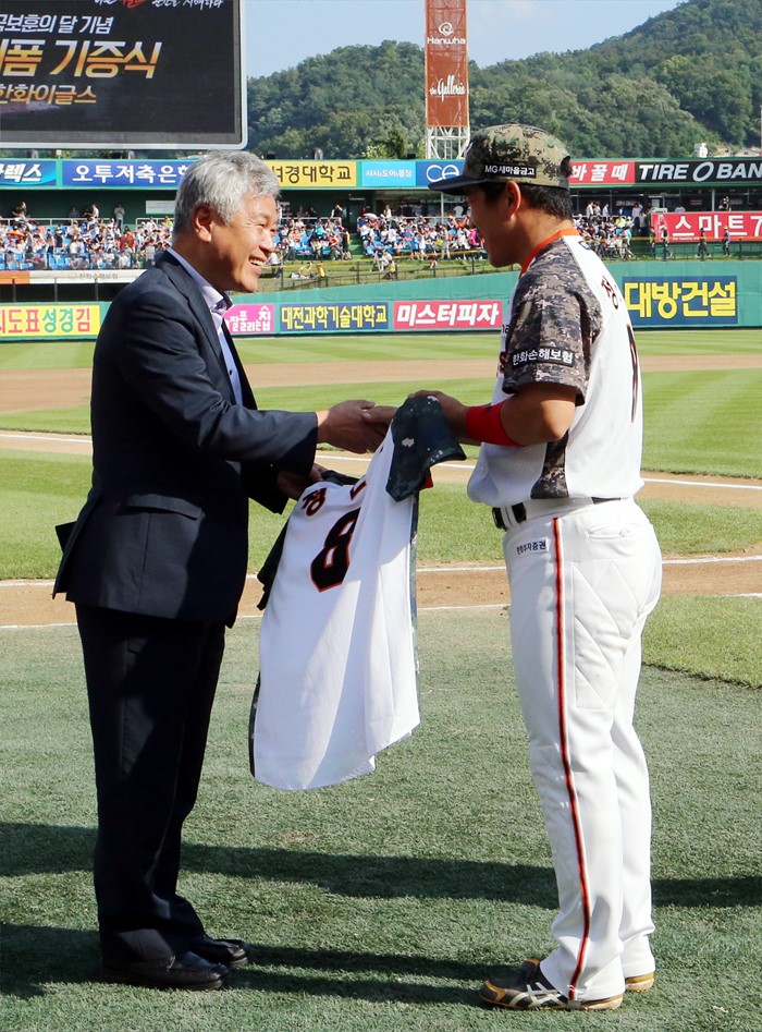 (대전=포커스뉴스) 25일 오후 대전 한화생명이글스파크에서 열린 2016 타이어뱅크 KBO리그 한화 이글스와 롯데 자이언츠 경기에 앞서 이명현 대전지방보훈청장과 정근우가 유니폼 전달식을 갖고 기념촬영을 하고 있다. <사진제공=한화이글스>