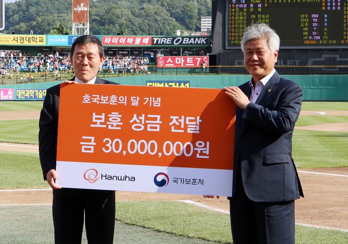 (대전=포커스뉴스) 25일 오후 대전 한화생명이글스파크에서 2016 타이어뱅크 KBO리그 한화 이글스와 롯데 자이언츠 경기에 앞서 보훈 성금 3천만원 전달식에서 이태종 (주)한화대표이사와 이명현 대전지방보훈청장이 기념촬영을 하고 있다. <사진제공=한화이글스>