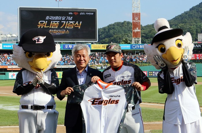 (대전=포커스뉴스) 25일 오후 대전 한화생명이글스파크에서 열린 2016 타이어뱅크 KBO리그 한화 이글스와 롯데 자이언츠 경기에 앞서 이명현 대전지방보훈청장과 정근우가 유니폼 전달식을 갖고 기념촬영을 하고 있다. <사진제공=한화이글스>