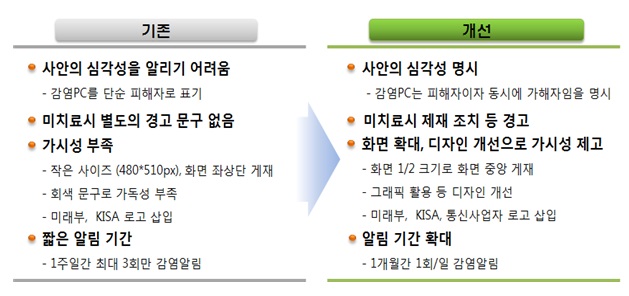 미래부는 이용자가 악성코드 감염의 심각성을 인지하고, 신속하게 치료를 할 수 있도록 ‘치료 안내 팝업창’의 크기·내용을 개선하고, 알림기간도 대폭 확대하기로 했다. 팝업창 크기는 PC화면의 2분의 1크기로 확대하고, 악성코드를 치료하지 않으면 인터넷 이용이 제한될 수 있음(정보통신망법 제47조의4 근거)을 안내한다. 또 이용자의 감염PC 치료율 향상을 위해 악성코드 감염 사실 및 치료 안내 기간을 1주일(3회)에서 1개월(일 1회)로 확대한다.