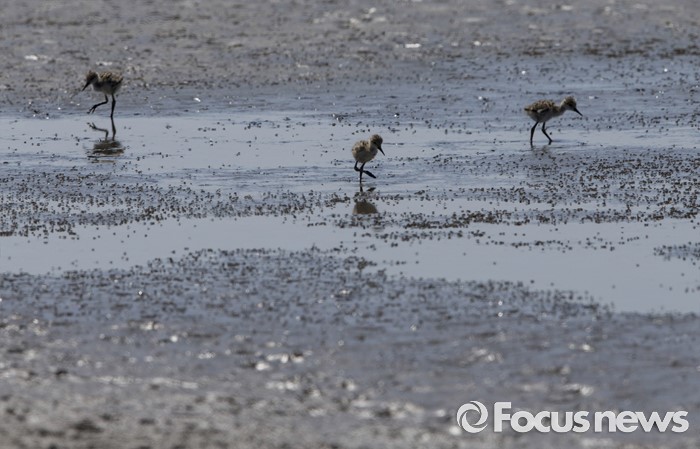 (인천=포커스뉴스) 부화한 지 약 1주일된 장다리물떼새 새끼들이 26일 오전 메말라가는 영종도 매립지 습지에서 고인물에 남아 있는 벌레를 잡아 먹고 있다. 이들은 약 3주후면 날개도 생기고 이동이 가능해, 물빼기 작업을 3주만 늦춰지기를 애타게 기대하고 있다.