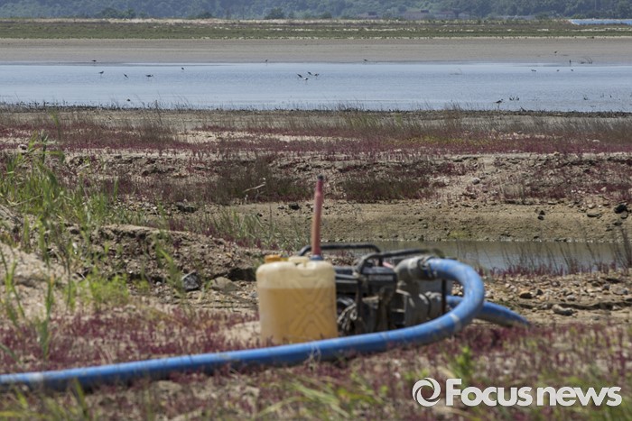 (이천=포커스뉴스)26일 오전 인천시 중구 중산동영종도 매립지내 작은 습지에서 시공사인 한진중공업측에서 양수기를 동원해 습지의 물을 빼자, 이곳에서 서식하던 물새들이 마지막 남은 물쪽으로 몰리고 있다.