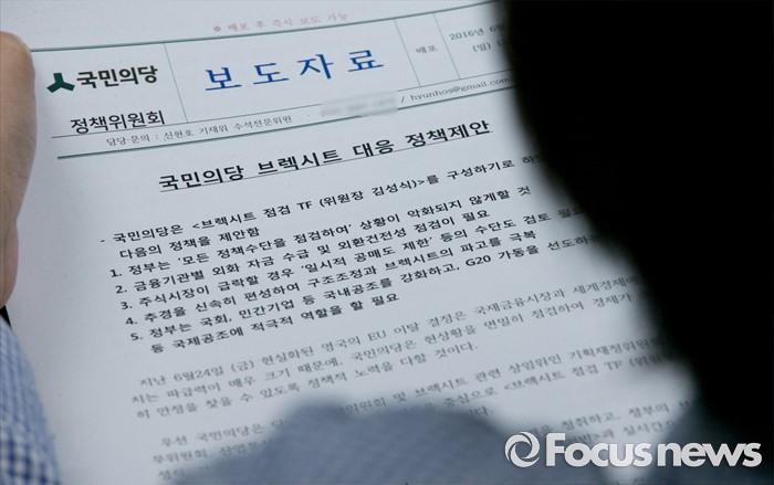(서울=포커스뉴스)26일 오전 서울 여의도 국회에서 열린 김성식 국민의당 정책위의장의 브렉시트 대응 정책제안 기자간담회에 참석한 취재진이 보도자료를 살펴보고 있다.