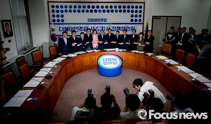 (서울=포커스뉴스) 26일 오전 서울 여의도 국회에서 열린 더불어민주당 시도지사 정책협의회에 참석한 단체장 및 의원들이 취재진을 향해 포즈를 취하고 있다. 왼쪽부터 변재일 정책위의장, 이시종 충북도지사, 권선택 대전시장, 이낙연 전남도지사, 박영선 참좋은지방정부위원회 공동위원장, 박원순 서울시장, 우상호 원내대표, 윤장현 광주시장, 이춘희 세종시장, 최문순 강원도지사, 김현미 예산결산특별위원장, 김태년 예결위 더민주 간사.