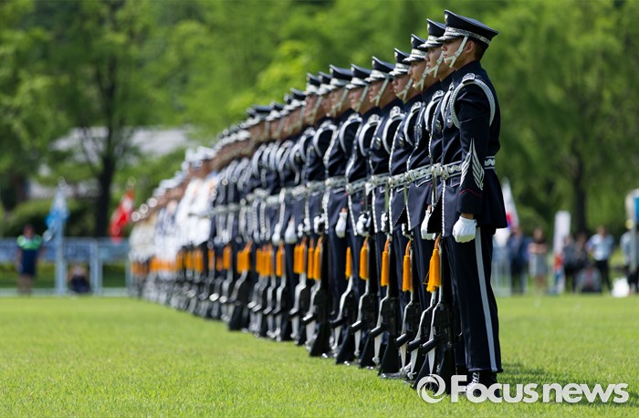 (서울=포커스뉴스) 26일 오후 서울 동작구 국립서울현충원 겨레얼마당에서 국방부 군악대와 의장대가 호국보훈의 달을 맞아 전통의장 및 퍼레이드 시범을 선보이고 있다.