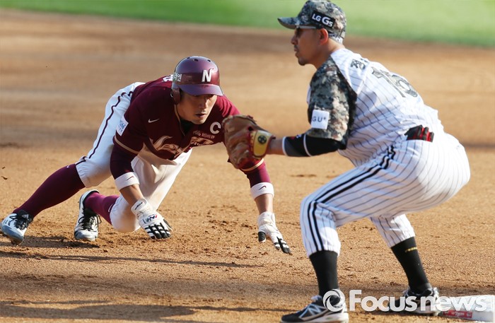 (서울=포커스뉴스) 26일 서울 잠실구장에서 열린 2016 프로야구 넥센-LG 경기 3회초 1사후 내야안타로 진루한 넥센 1루주자 서건창이 LG 투수 류제국의 견제구에 황급히 귀루하고 있다.