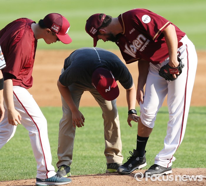 (서울=포커스뉴스) 26일 서울 잠실구장에서 열린 2016 프로야구 넥센-LG 경기 3회말 2사후 LG 히메네스의 타구에 맞은 넥센 투수 맥그레거의 다리 부위를 트레이너가 살펴 보고 있다.