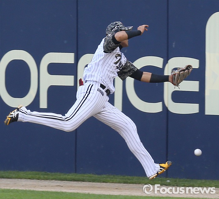 (서울=포커스뉴스) 26일 서울 잠실구장에서 열린 2016 프로야구 넥센-LG 경기 8회초 1사 1루에서 LG 우익수 채은성이 넥센 이택근의 타구를 놓치고 있다.