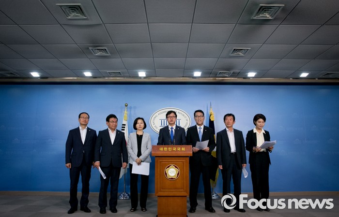 (서울=포커스뉴스) 홍영표 국회 환경노동위원장 등 더불어민주당 소속 환노위원들이 27일 오전 서울 여의도 국회 정론관에서 2017년 적용될 최저임금 결정시한을 하루 앞두고 인상 촉구 기자회견을 하고 있다.
