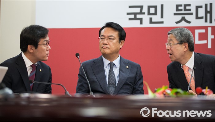 (서울=포커스뉴스) 김희옥(오른쪽) 새누리당 혁신비대위원장과 정진석(가운데) 원내대표가 27일 오전 서울 여의도 당사에서 열린 혁신비상대책위원회 회의에 참석해 김영우 비대위원과 대화하고 있다.